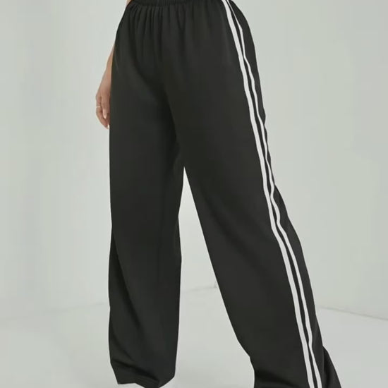Elevate your casual wardrobe with these Black Wide Leg Baggy Trousers, accented by sleek white side stripes for a sporty-chic finish. Designed with a relaxed fit and wide-leg silhouette, they offer all-day comfort while keeping your style on point. Perfect for pairing with hoodies, tees, or crop tops, these trousers are a versatile must-have for effortless streetwear looks.