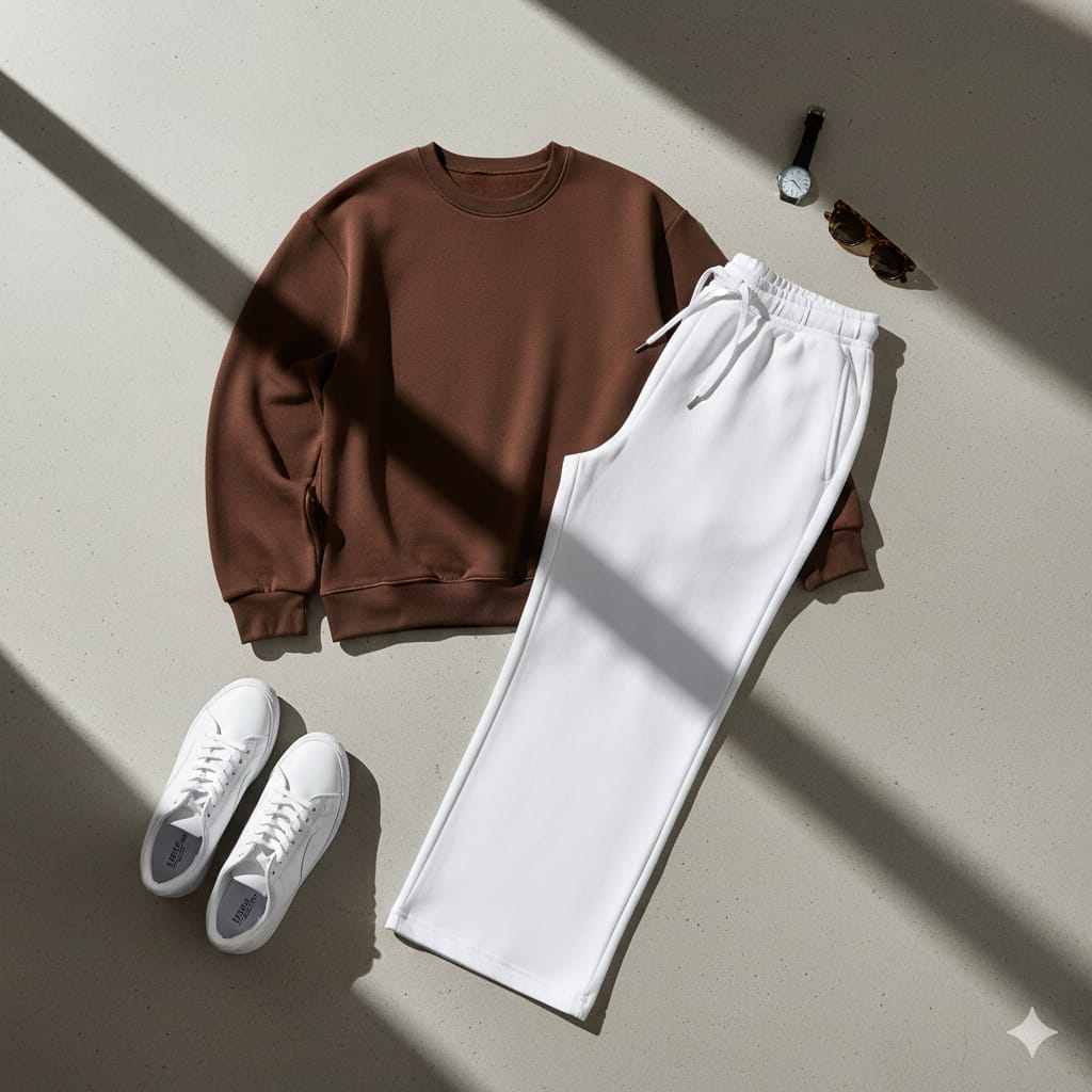 Elevate your casual style with the Onyx & Snow Coord Set, the ultimate blend of comfort and minimalist chic. This classic Brown and white combination features an ultra-soft, premium Cozy Brown Fleece Sweatshirt paired with relaxed-fit, wide-leg white joggers/sweatpants.