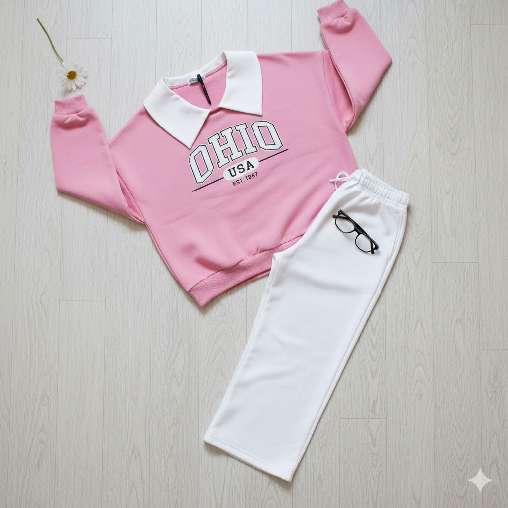 “OHIO USA” Fleece Collar Sweatshirt & White Wide Leg Trouser Co-ord Set
